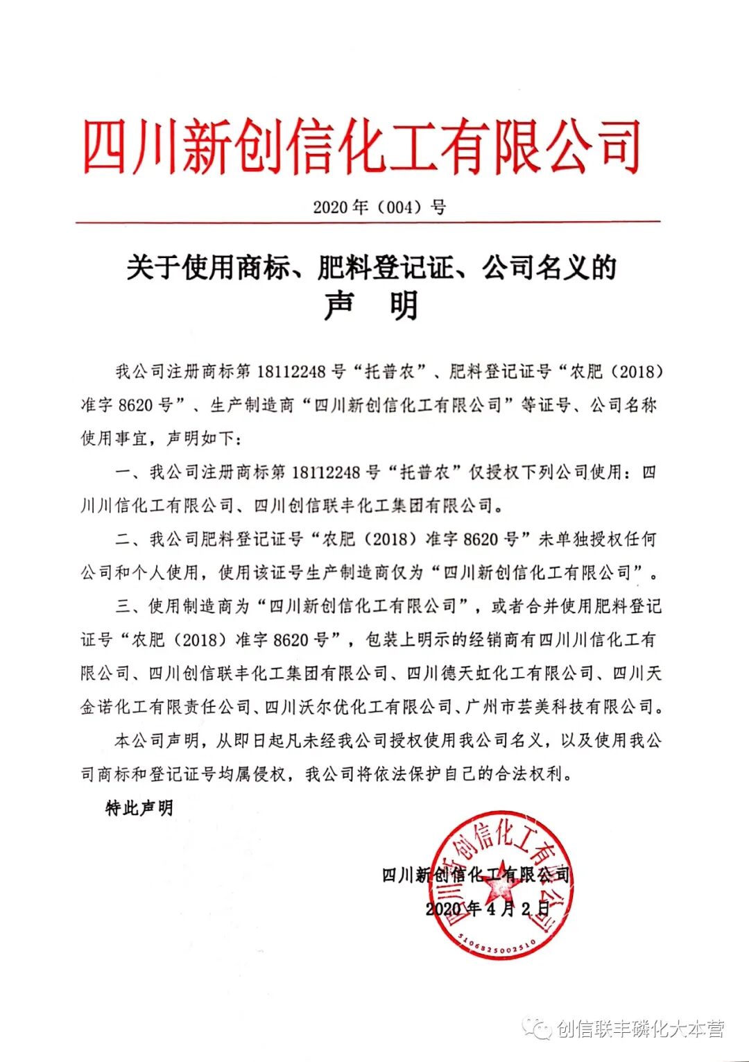 关于我公司注册商标第18112248号“托普农”、肥料登记证号“农肥(2018)准字8620号”、生产制造提供商“四川新创信化工有限公司”等证号、公司名称使用事宜,声明如下: